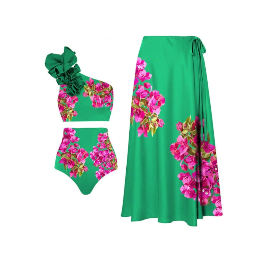 • Top: A one-shoulder, asymmetrically cut bikini top with a ruffle detail. It offers a feminine and chic look with intense pink floral patterns on a vibrant green background. The one-shoulder design creates a modern and distinctive style.