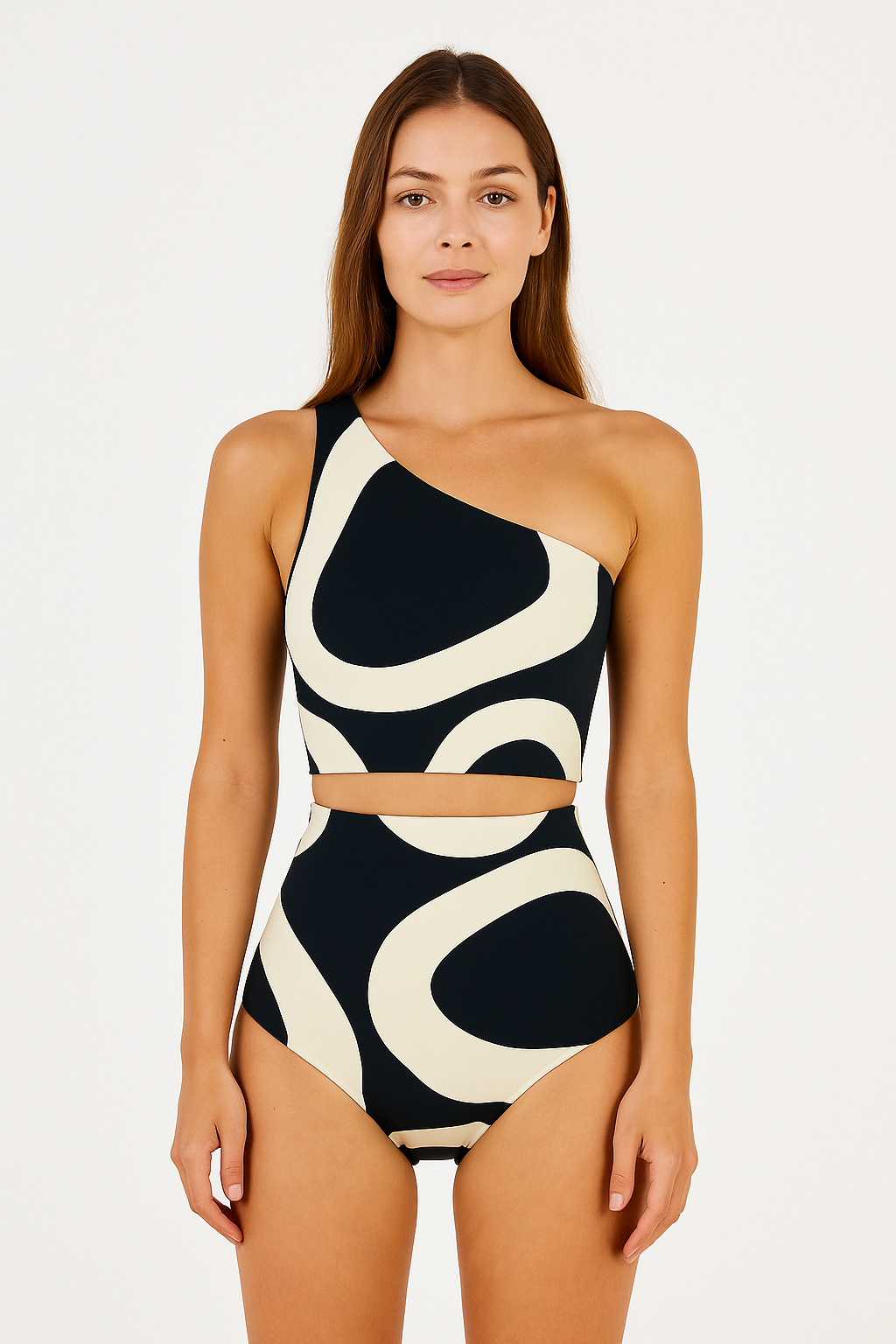 Design: The high-waisted cut hugs the abdomen for a stylish and comfortable fit. The swimsuit's patterns continue down the bottom, creating a seamless look.