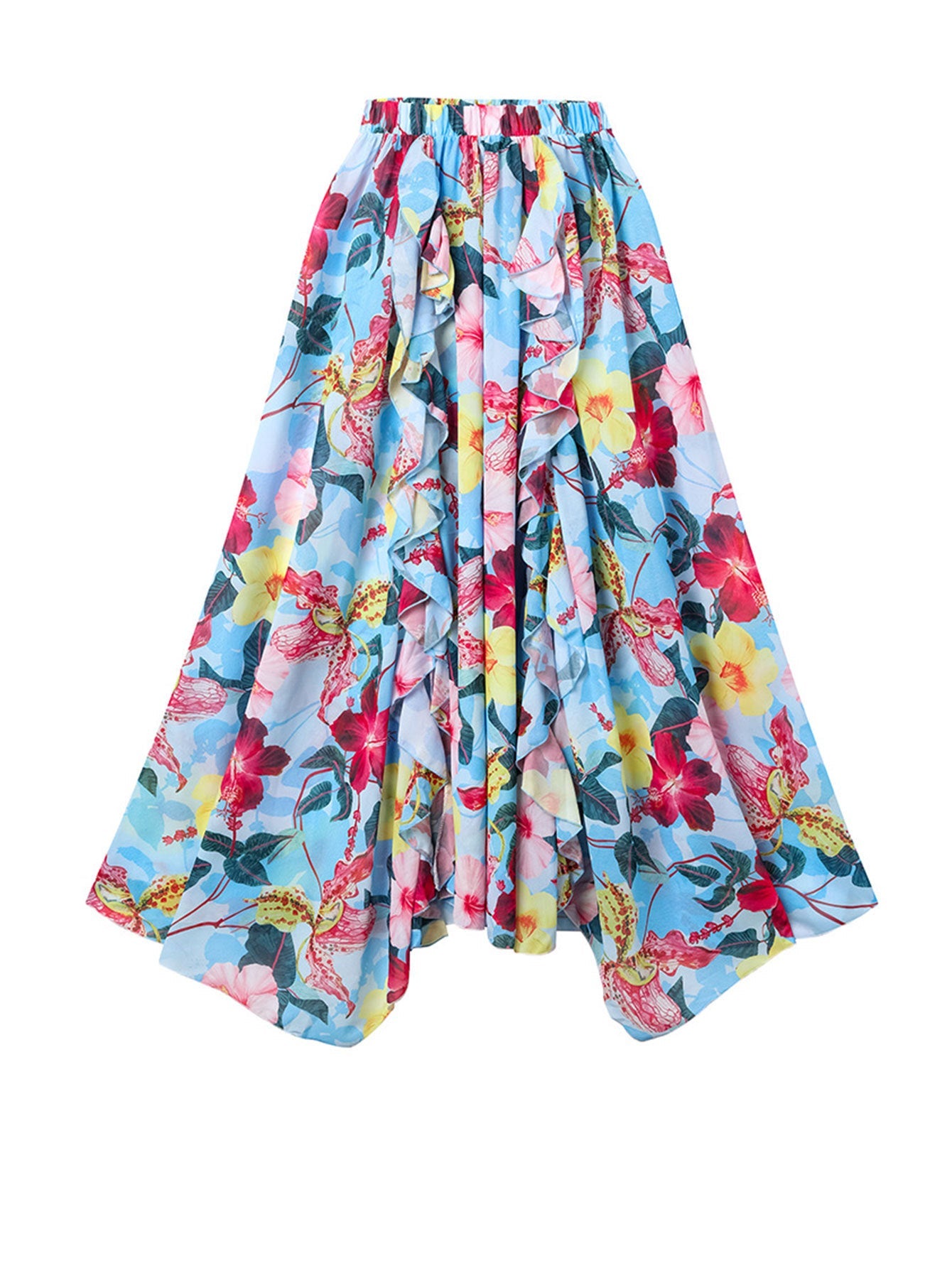 Bringing summer's energy to the beach, this colorful floral bikini set combines tropical elegance with a touch of elegance. The vibrant bikini top, with ruffled shoulder details, hugs the body for a feminine look. The high-waisted bikini bottoms offer a comfortable fit, while the long skirt in the same pattern perfectly complements the beach look.