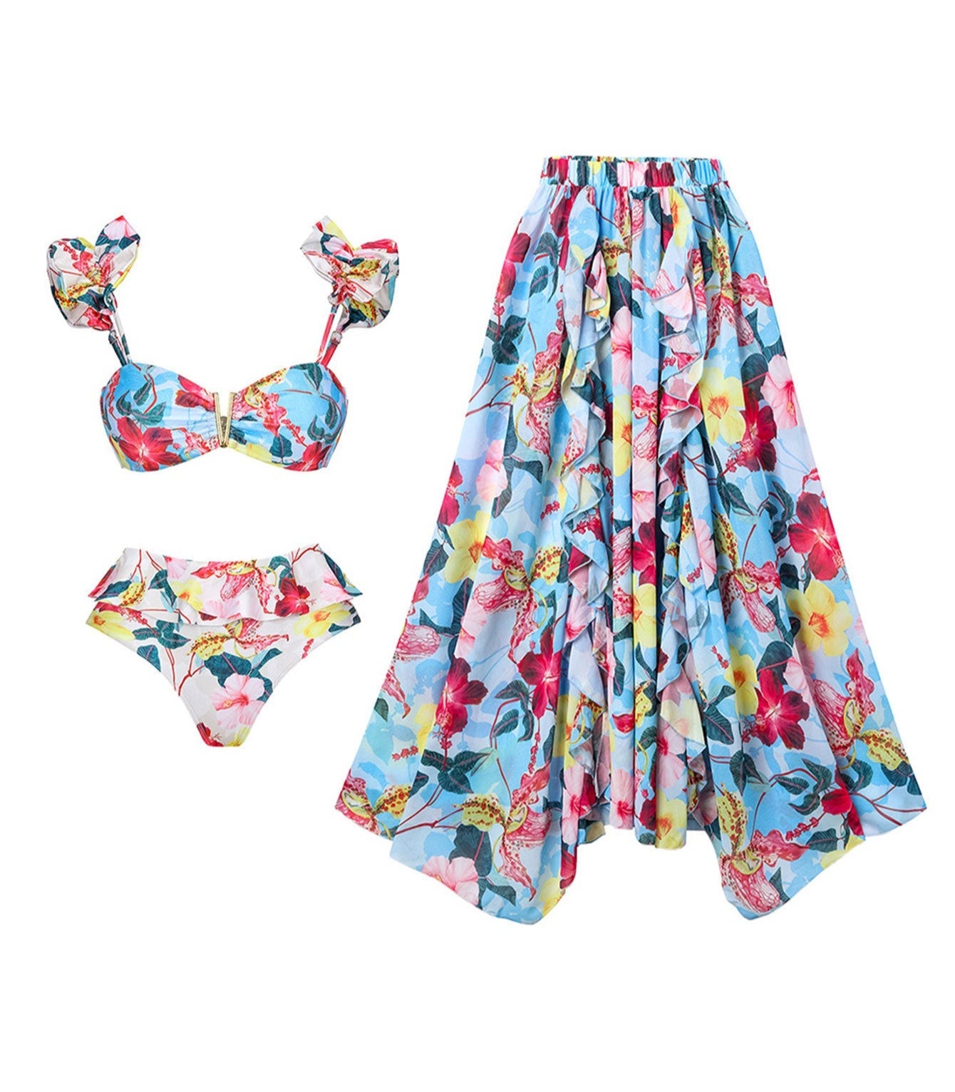 • Three-piece set: bikini top, bikini bottoms and skirt