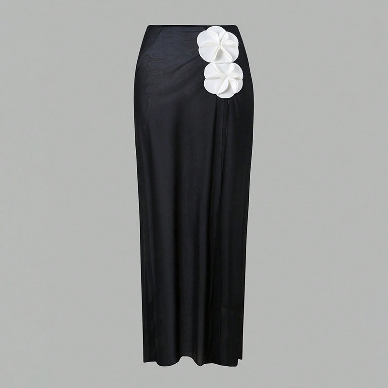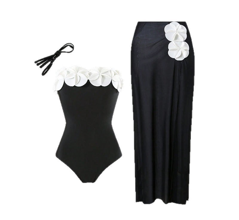 This black swimsuit, combining the elegance of minimalism with the delicate touch of florals, takes beach chic to the next level. Its strapless cut offers a modern look, while the white floral appliqués on the bust and sarong create a striking contrast. Its comfort and aesthetic appeal make it a luxurious beach style.