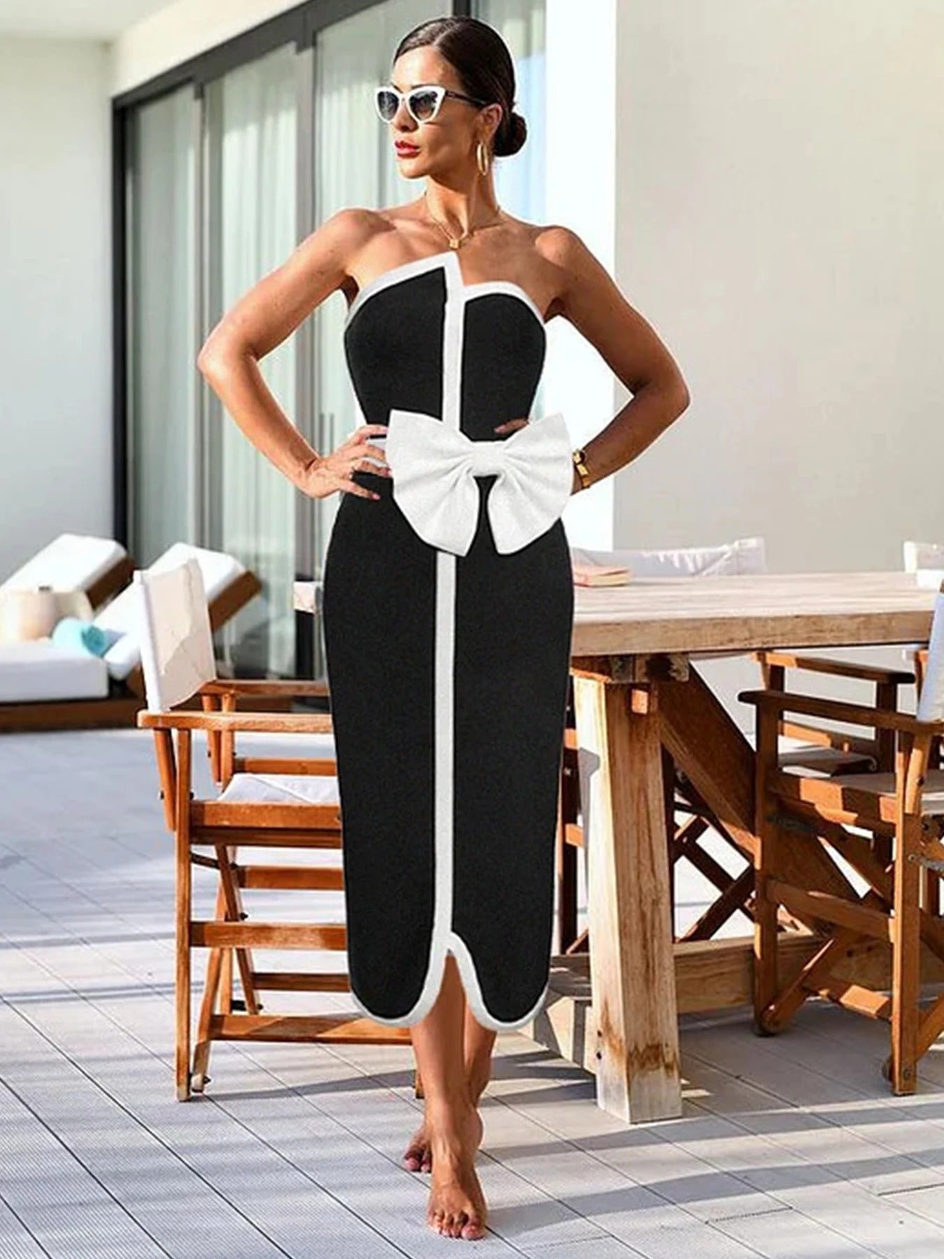 One-shoulder, asymmetrical cut swimsuit: A giant white bow at the chest adds a touch of sophisticated femininity.