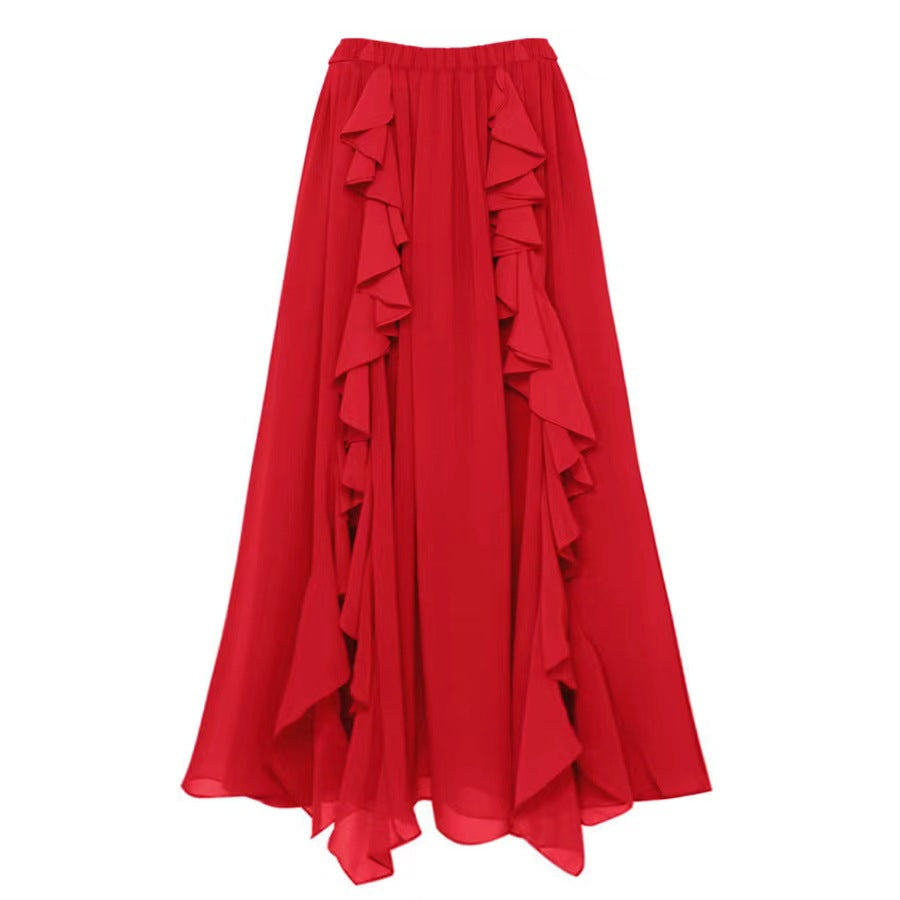 • Design: The long, asymmetrical skirt is made of a lightweight chiffon-like fabric. Layers of flounces (frills) cascade down the skirt. These details give the skirt a graceful movement and dynamism.